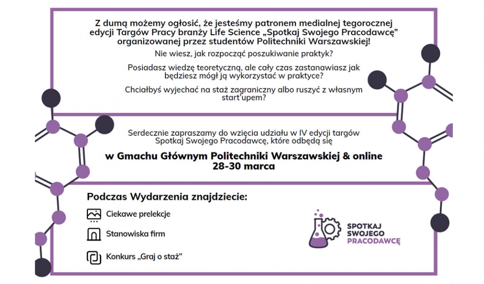 W odpowiedzi na problem braku targów pracy skierowanej do tej konkretnej grupy na Politechnice Warszawskiej powstały Targi Pracy - Spotkaj Swojego Pracodawcę. Grupa studentów technologii chemicznej, biotechnologii, inżynierii chemicznej oraz biogospodarki postanowiła połączyć swoje siły